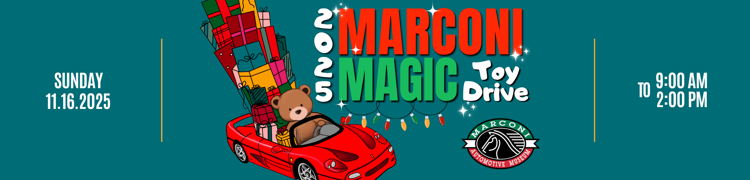 We are excited to announce that our 5th Annual “Marconi Magic Toy Drive” is just around the corner! Join us on Sunday, November 16th, from 10:00 AM to 2:00 PM at the Marconi Automotive Museum & Foundation for Kids. Each year, our Toy Drive brings the community together to spread joy to children and families in need during the holiday season. Last year, the Marconi Foundation for Kids surpassed the previous record of funds raised for the Marconi Magic Toy Drive, and this year we’re aiming even higher! Every dollar and every toy makes a difference, no donation is too small. We kindly ask that all toys be new, unopened, and in their original packaging. The event will be cars & coffee-style: you’re welcome to stay and enjoy the cars on display, or simply drive through to drop off your donation. If you’re bringing an exotic or collector car, please arrive early, as display spots are limited. 100% of all funds donated will go directly toward purchasing toys and necessities, helping to make this holiday season brighter for the kids and families who need it most. Thank you for your continued support, let’s spread the word and fill that trailer! Contact your tax professional for possible deductions; the Marconi Foundation for Kids® Tax ID is 33-0650060.